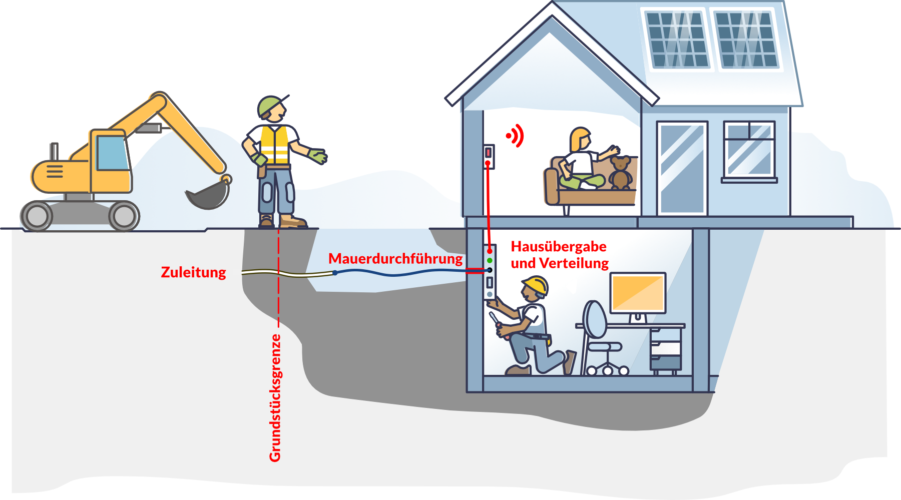 Für den Anschluss zum und in das Haus stehen wir Ihnen als erfahrener Partner zur Verfügung. Wir klären vor Ort die Gegebenheiten und machen Ihnen ein Maßgeschneidertes Angebot.